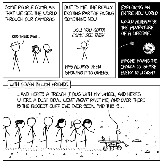 If fans are taken to something, spaces for fans to engage with one another grow organically on their own, especially with the versatility of the internet. This is shown by xkcd’s subreddit. Fans feel free to post, link to comics, and simultaneously react (the Opportunity rover currently has people feeling some feels).